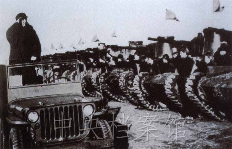紀錄片:(群眾呼聲)中國人民萬歲!(紀錄片解說)檢閱開始了。東北野戰軍參謀長劉亞樓將軍,向毛主席報告受檢閱的部隊全部到齊。坦克塔上飄揚著紅旗,坦克手精神百倍,向著自己的領袖敬禮。